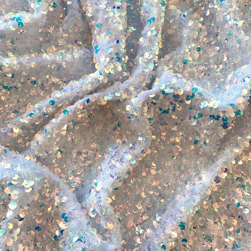 Бархатное полотно белого цвета по всей поверхности усеяно объемными глянцевыми "бензиновыми" пайетками. Ткань пластичная, прекрасно драпируется и укладывается в складки. Легко садится на фигуру за счёт основы с эластаном. Пайетки на бархате эффектно смотрятся в виде широких оборок и воланов, юбок прямого силуэта, свободных платьев-балахонов, курток, бомберов и топов с напусками.