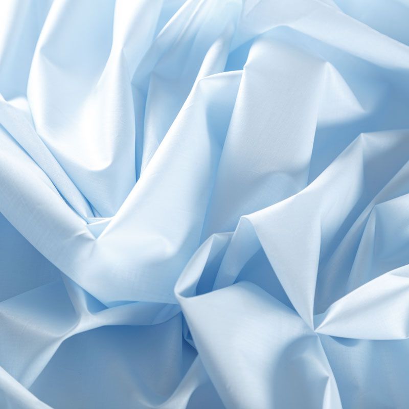 Итальянский хлопковый батист в голубом оттенке, тонкий, легкий, полупрозрачный, приятный на ощупь, нежный, хорошо и мягко драпируется, тянется за счет эластана в составе. Батист подойдёт для модных блуз с объёмными рукавами, летних платьев и сарафанов с длинной летящей юбкой, прозрачных рубашек, декорированных объёмными бантами, детской одежды.