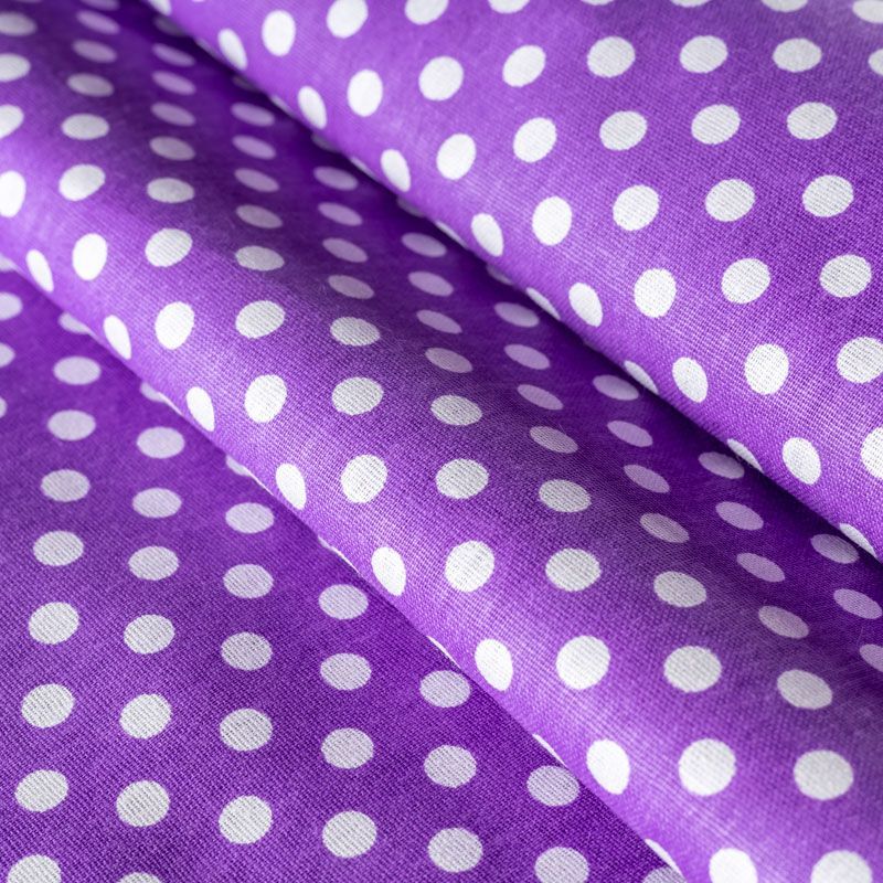 Плотная натуральная ткань с особым принципом переплетения нитей: крест-накрест. Имеет гладкую матовую поверхность чуть шероховатую на ощупь, не тянется, немного просвечивает. Прочная и стойкая к износу, надолго сохраняет яркость красок, не растягивается при стирке, практически не мнется. Мелкий белый горошек (5 мм) на ярком фиолетовом фоне прекрасно подойдет для пошива постельного белья, изготовления пеленок, бортиков для кроватки, домашней одежды и других предметов интерьера.