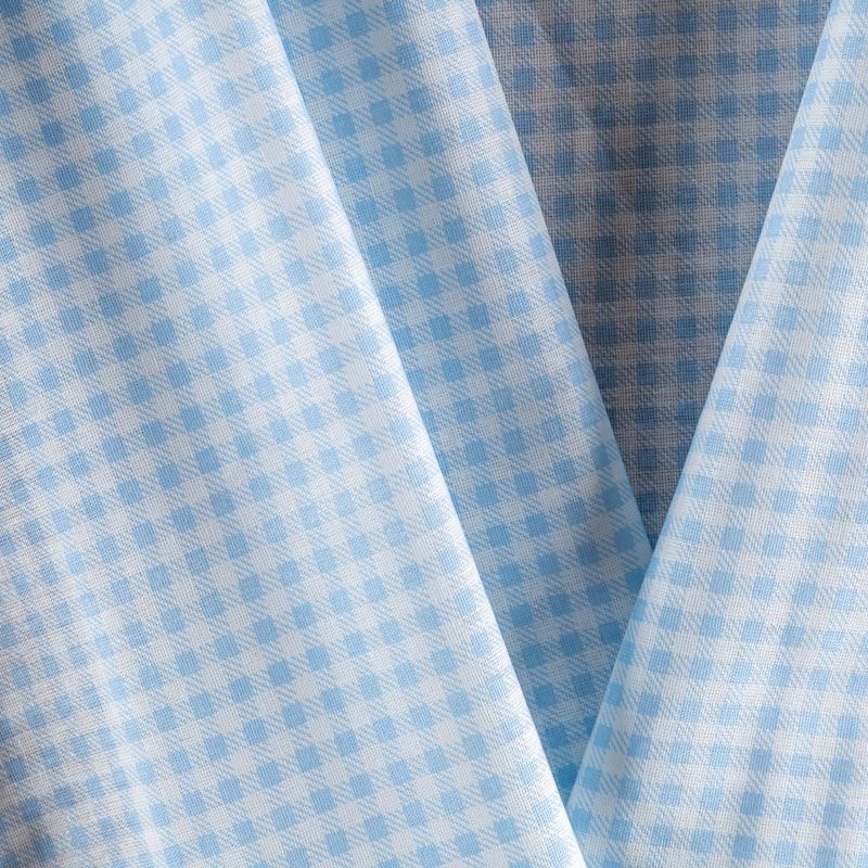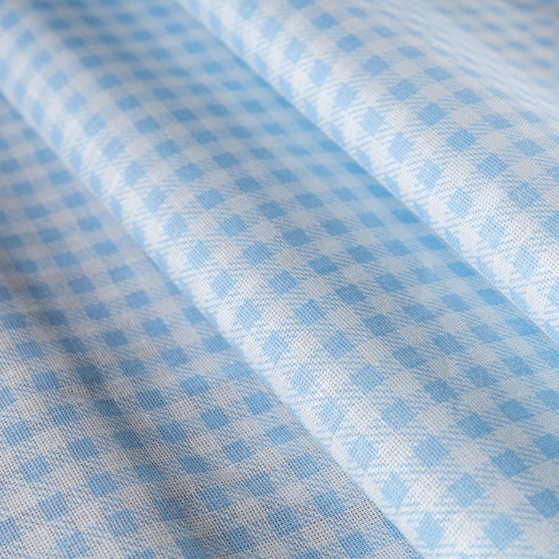 Плотная натуральная ткань с особым принципом переплетения нитей: крест-накрест. Имеет гладкую матовую поверхность чуть шероховатую на ощупь, не тянется, немного просвечивает. Прочная и стойкая к износу, надолго сохраняет яркость красок, не растягивается при стирке, практически не мнется. Рисунок в мелкую клеточку голубого цвета на белом фоне прекрасно подойдет для пошива постельного белья, изготовления пеленок, бортиков для кроватки, домашней одежды и других предметов интерьера.