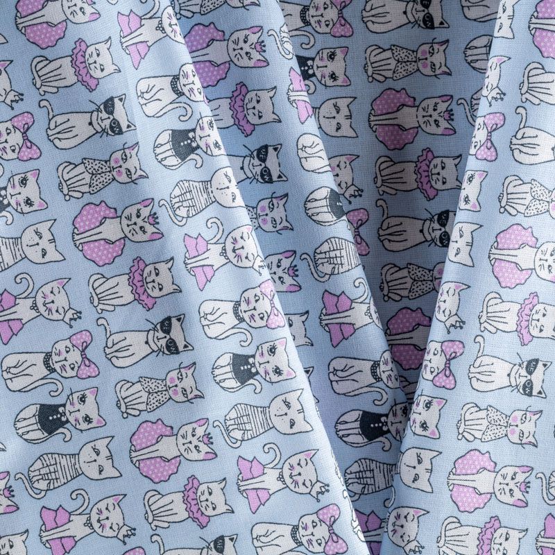 Плотная натуральная ткань с особым принципом переплетения нитей: крест-накрест. Имеет гладкую матовую поверхность, немного шероховатая на ощупь, не тянется, немного просвечивает. Прочная и стойкая к износу, надолго сохраняет яркость красок, практически не мнется. Милый детский принт в виде белых кошечек на холодном голубом фоне прекрасно подойдет для пошива постельного белья, изготовления пеленок, бортиков для кроватки, домашней одежды и других предметов интерьера.