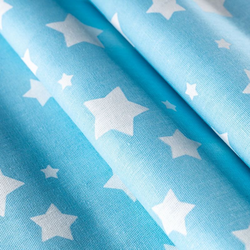 Плотная натуральная ткань с особым принципом переплетения нитей: крест-накрест. Имеет гладкую матовую поверхность чуть шероховатую на ощупь, не тянется, немного просвечивает. Прочная и стойкая к износу, надолго сохраняет яркость красок, не растягивается при стирке, практически не мнется. Принт в виде белых звездочек разного размера на небесно-голубом фоне прекрасно подойдет для пошива постельного белья, изготовления пеленок, бортиков для кроватки, домашней одежды и других предметов интерьера.