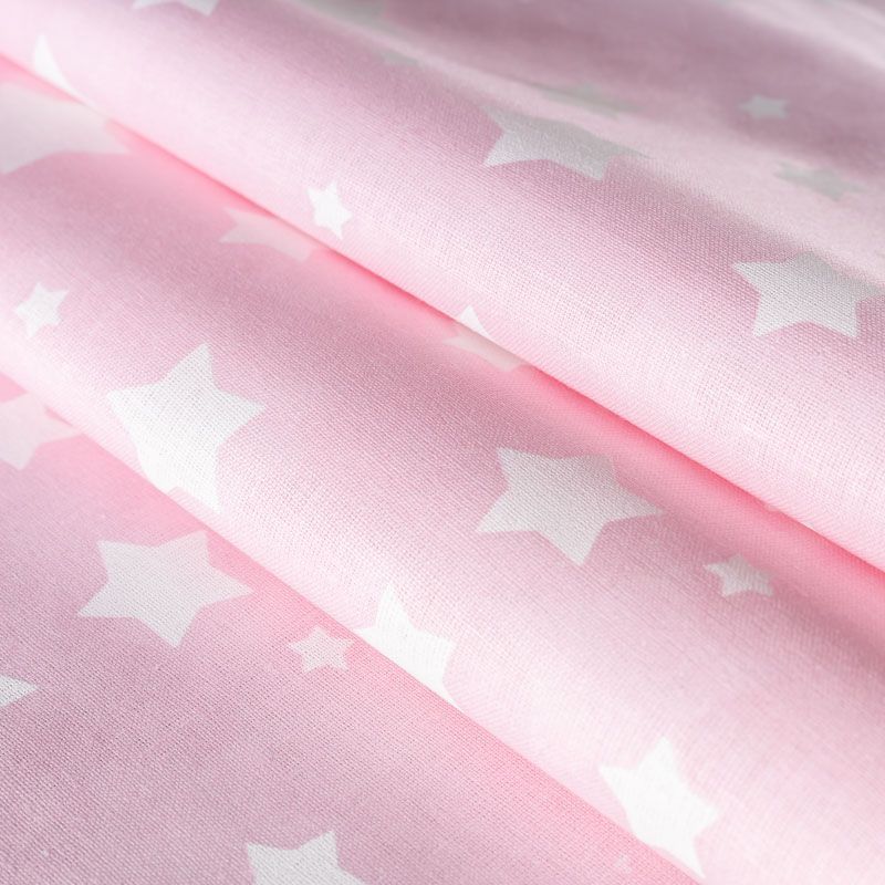 Плотная натуральная ткань с особым принципом переплетения нитей: крест-накрест. Имеет гладкую матовую поверхность чуть шероховатую на ощупь, не тянется, немного просвечивает. Прочная и стойкая к износу, надолго сохраняет яркость красок, не растягивается при стирке, практически не мнется. Принт в виде  белых звездочек разного размера на нежном розовом фоне прекрасно подойдет для пошива постельного белья, изготовления пеленок, бортиков для кроватки, домашней одежды и других предметов интерьера.