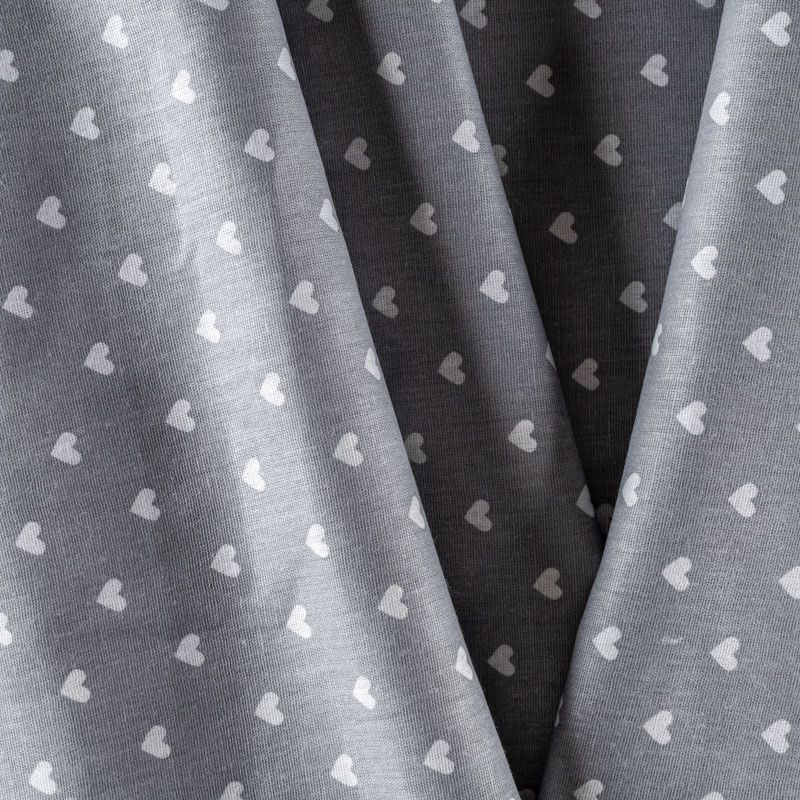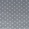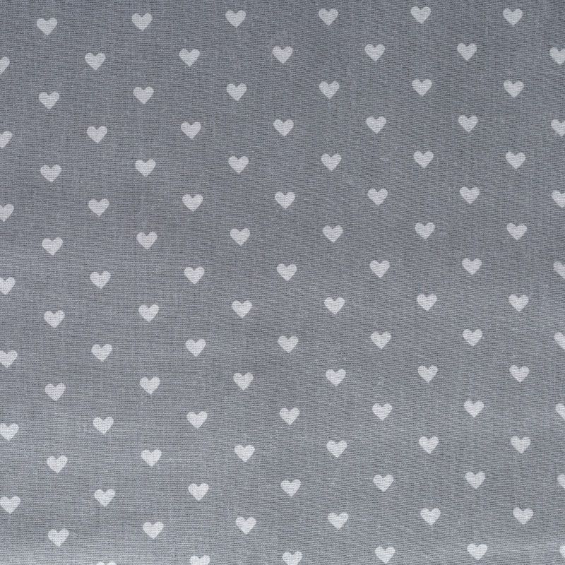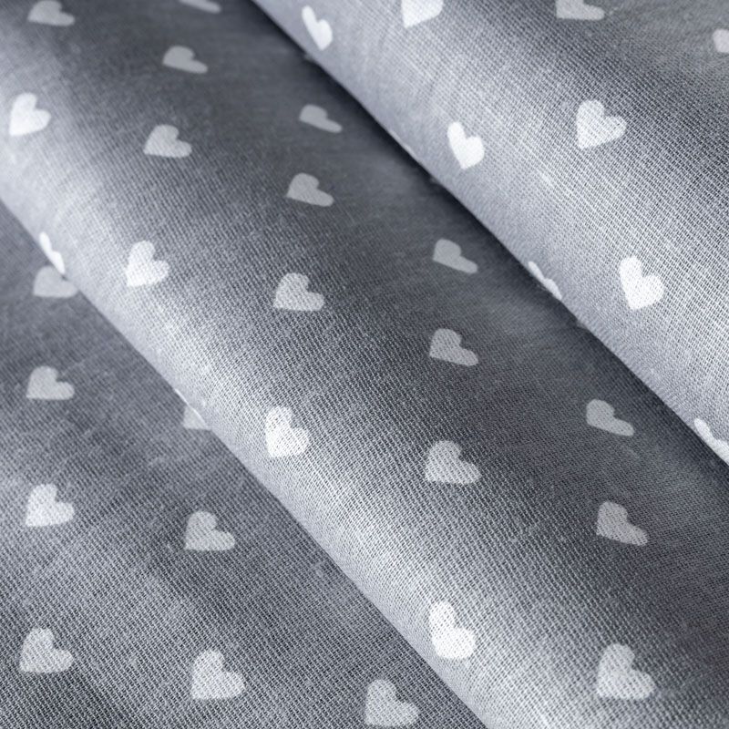 Плотная натуральная ткань с особым принципом переплетения нитей: крест-накрест. Имеет гладкую матовую поверхность, немного шероховатая на ощупь, не тянется, немного просвечивает. Прочная и стойкая к износу, надолго сохраняет яркость красок, практически не мнется. Милый принт в виде белых сердечек на нейтральном сером фоне прекрасно подойдет для пошива постельного белья, изготовления пеленок, бортиков для кроватки, домашней одежды и других предметов интерьера.