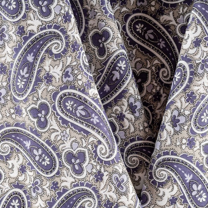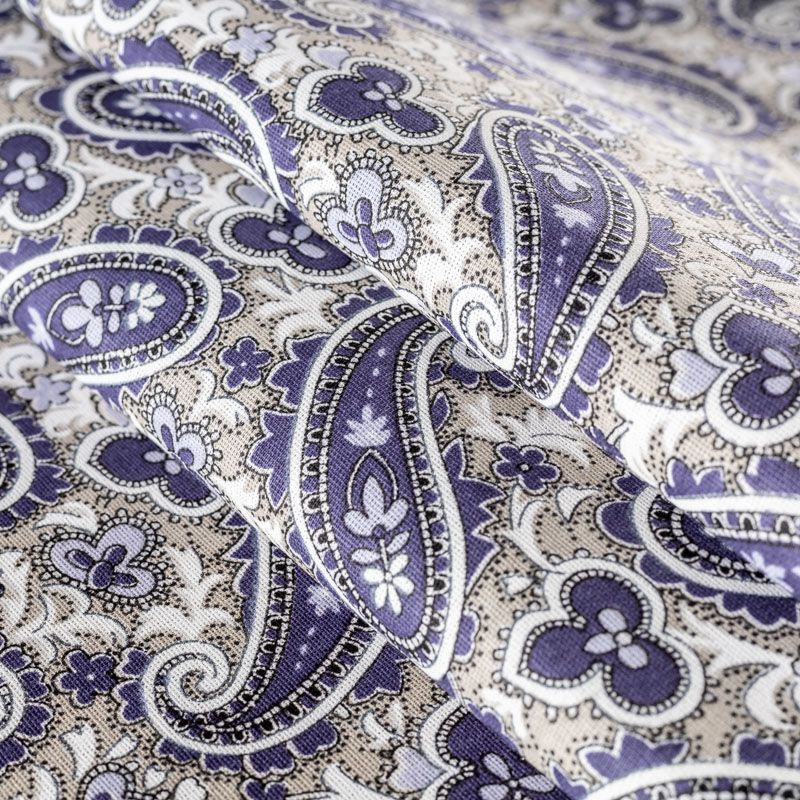 Плотная натуральная ткань с особым принципом переплетения нитей: крест-накрест. Имеет гладкую матовую поверхность, немного шероховатая на ощупь, не тянется, немного просвечивает. Прочная и стойкая к износу, надолго сохраняет яркость красок, практически не мнется. Восточный принт пейсли на спокойном сером фоне прекрасно подойдет для пошива постельного и столового белья, изготовления домашней одежды и других предметов интерьера.