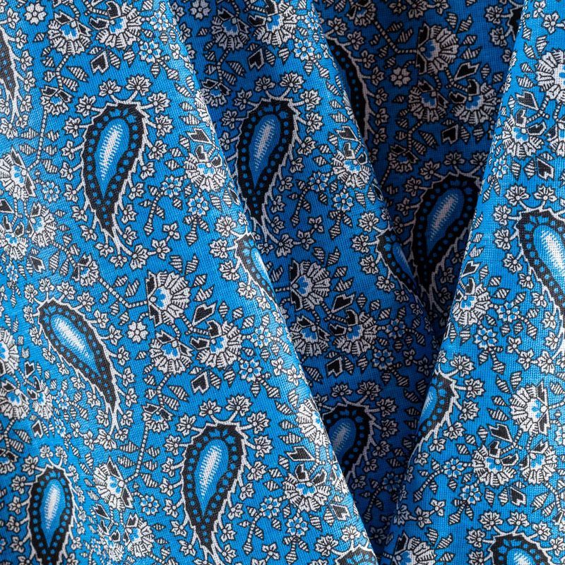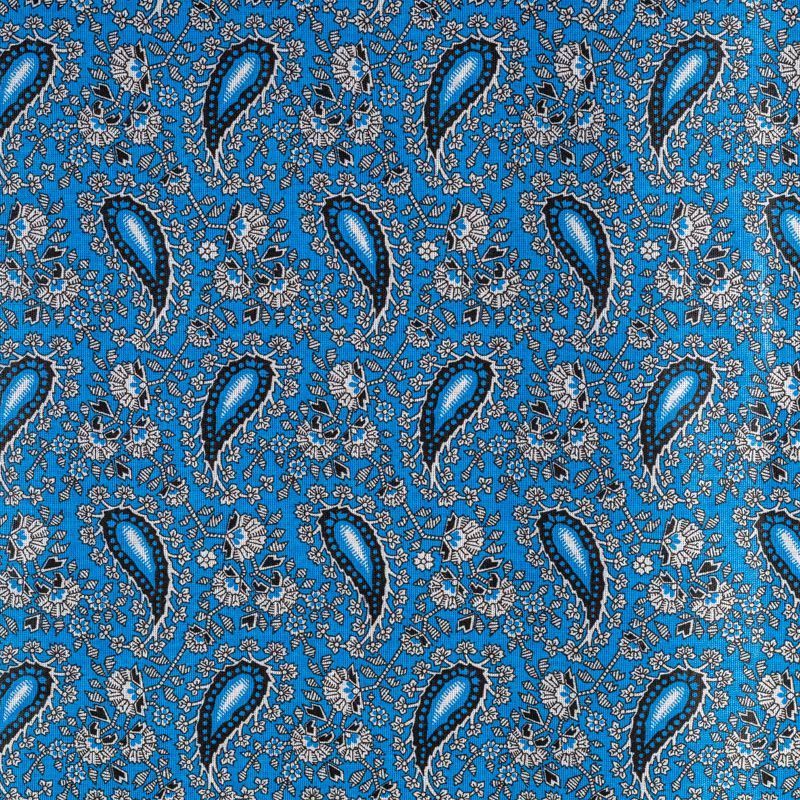 Плотная натуральная ткань с особым принципом переплетения нитей: крест-накрест. Имеет гладкую матовую поверхность, немного шероховатая на ощупь, не тянется, немного просвечивает. Прочная и стойкая к износу, надолго сохраняет яркость красок, практически не мнется. Восточный принт пейсли на насыщенном васильковом фоне прекрасно подойдет для пошива постельного и столового белья, изготовления домашней одежды и других предметов интерьера.