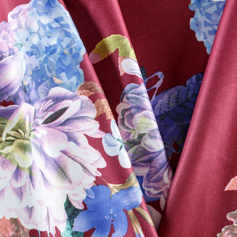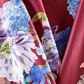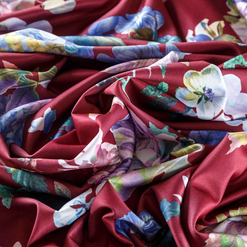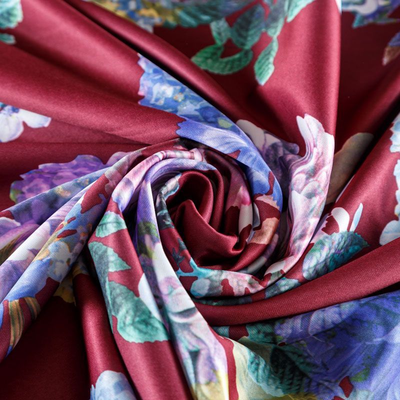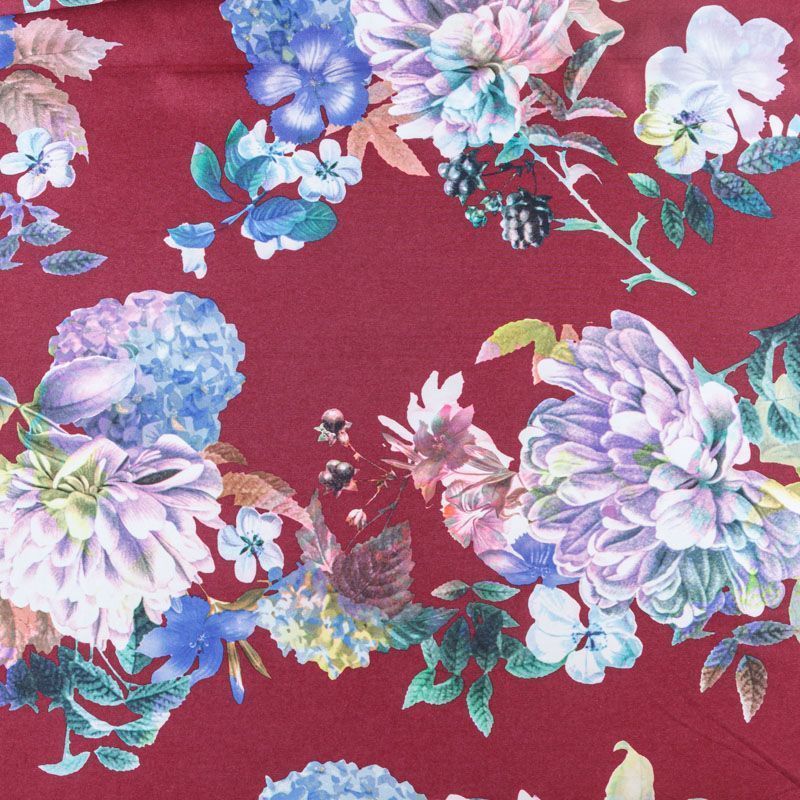 Плотное трикотажное полотно бордового оттенка с цветочным принтом. Обе стороны ткани ровные, гладкие. Материал эластичный, имеет растяжимость по всем сторонам, хорошо держит форму, уютный, приятный к телу и удобный в носке. Применяется в пошиве платьев, юбок, костюмов, жакетов.