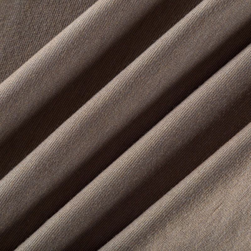 Плотное трикотажное полотно коричневого оттенка с холодным подтоном. Обе стороны ткани ровные, гладкие. Материал эластичный, имеет растяжимость по всем сторонам, хорошо держит форму, уютный, приятный к телу и удобный в носке. Применяется в пошиве платьев, юбок, костюмов, жакетов.