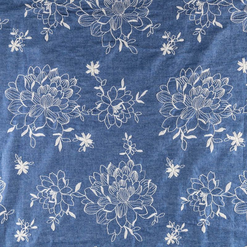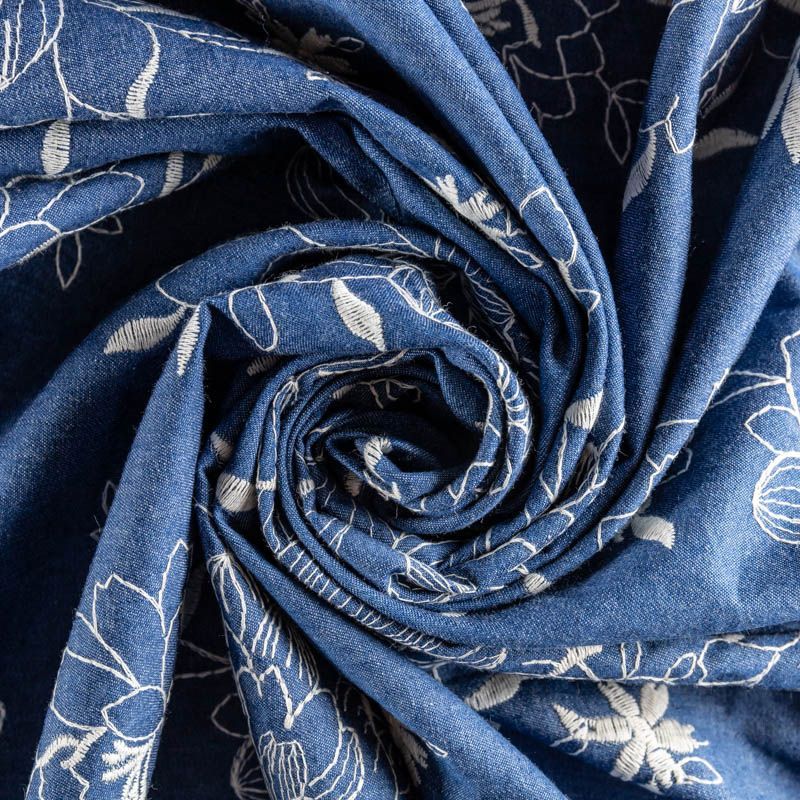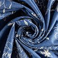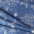 На сине-голубом фоне цветы, вышитые белой нитью со сдержанным атласным блеском. Полотно легкое, средней плотности, очень пластичное, не держит форму.  Материал отлично драпируется, формируя мягкие складки. Подойдет для прямых, расклешенных платьев, сарафанов, платья-рубашки, юбки или туники.