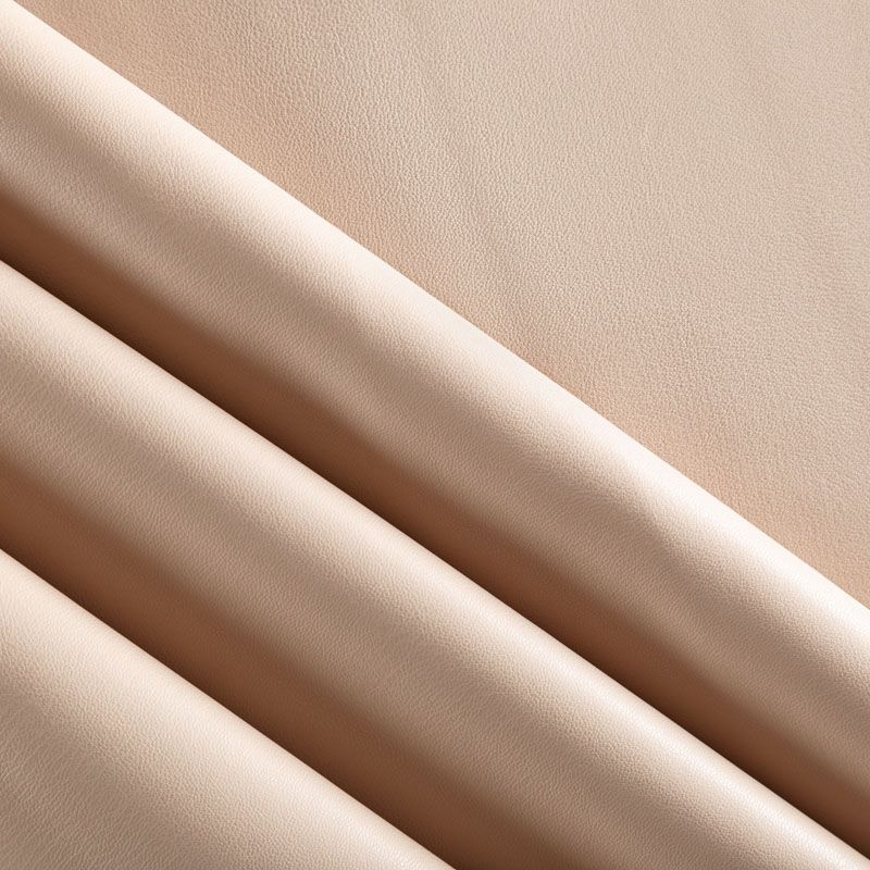 Искусственный материал, имитирующий натуральную кожу бежевого оттенка. Поверхность ткани матовая, гладкая, изнаночная сторона с имитацией светлой замши. Приятная на ощупь, тянется, не просвечивает, пластичная. Подойдет для пошива куртки, костюма, платья, юбки, брюк, шорт, комбинезона, сумки, рюкзака.