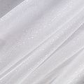 Полотно мягкое и матовое с искрящимися блестками. Неплохо драпируется в  слегка держащие форму складки, имеет мелкое сетчатое плетение, прияный на ощупь. Подойдет для пошива платья, юбки-пачки, фаты и других коктейльных и вечерних нарядов или аксессуаров.