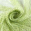 Тонкая прозрачная сетка средней жесткости зеленого оттенка декорирована клеевыми стразами в тон полотна. Используется для пошива одежды для различных праздников, концертов, пышных юбок, платьев, а также для отделки и украшения, создания предметов декора и украшения помещений для торжественных мероприятий.
