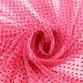 Тонкая прозрачная сетка средней жесткости малинового оттенка декорирована клеевыми стразами в тон полотна. Используется для пошива одежды для различных праздников, концертов, пышных юбок, платьев, а также для отделки и украшения, создания предметов декора и украшения помещений для торжественных мероприятий.