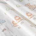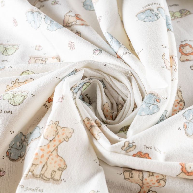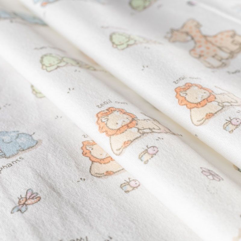 Износостойкий мягкий материал, не раздражает кожу, не садится, отлично впитывает влагу и хорошо удерживает тепло. На лицевой стороне мягкий ворс. Милый детский принт в виде рисованных тропических животных на белом фоне прекрасно подойдет для пошива постельного белья, изготовления пеленок, бортиков для кроватки, домашней одежды, пижамы и других предметов интерьера.