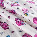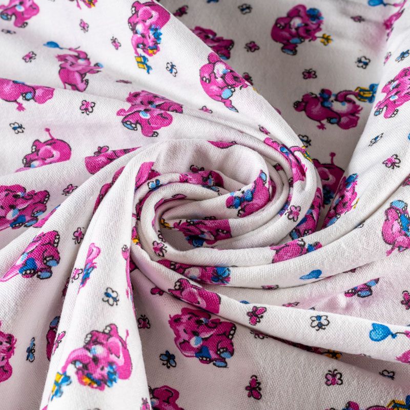 Износостойкий мягкий материал, не раздражает кожу, не садится, отлично впитывает влагу и хорошо удерживает тепло. На внутренней стороне короткий мягкий ворс. Милый детский принт в виде рисованных розовых слоников на белом фоне прекрасно подойдет для пошива постельного белья, изготовления пеленок, бортиков для кроватки, домашней одежды, пижамы и других предметов интерьера.