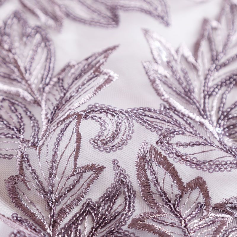 Кружевное полотно на сетчатой основе сиреневого оттенка с растительным узором, расположенным по ширине ткани. Тонкое, легкое, очень мягкое и пластичное, хорошо драпируется, приятное тактильно. Вышивка дополнена глянцевыми пайетками в тон. С обеих сторон ткань украшена симметричными фестонами, что придает полотну законченный и нарядный вид. Великолепно будет смотреться в нарядном вечернем, свадебном платье, платье на выпускной бал, в юбках, блузках, топах. На изделие набирается объемом.