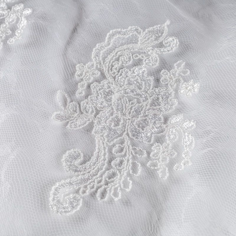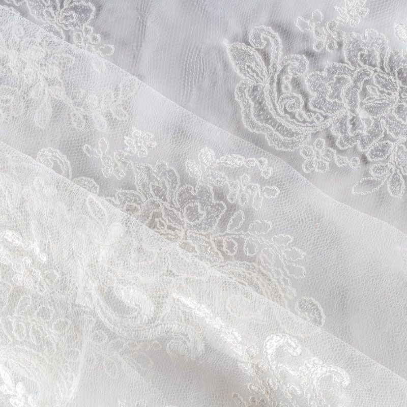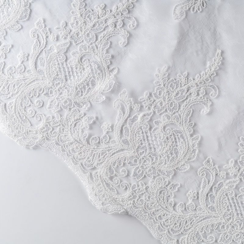 Кружевное полотно на сетчатой жаккардовой основе оттенка молочного жемчуга с флористическим узором. Тонкое, легкое, очень мягкое и пластичное, хорошо драпируется, приятное тактильно. Вышивка оформлена кордовой нитью. С обеих сторон ткань украшена симметричными фестонами, что придает полотну законченный и нарядный вид. Великолепно будет смотреться в нарядном вечернем, свадебном платье, платье на выпускной бал, в юбках, блузках, топах. Также можно применять отдельные элементы для декора, которые вырезаются из полотна.