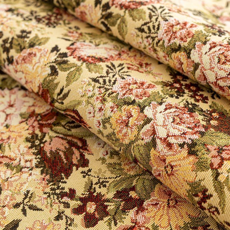 Гобелен представляет собой ткань, выполненную перекрестным плетением нитей с одномоментным созданием сюжетной или орнаментальной композиции. Это плотный материал высокую прочность и износостойкость. Гобелен используют для пошива плотных светонепроницаемых штор, декоративного домашнего текстиля и аксессуаров, в мебельном производстве для обивки мебели. Так же применяется в рукоделии: модные кошельки, сумочки, пояса и другие аксессуары и при изготовлении дизайнерской одежды. Очень летний принт - букеты из садовых и полевых цветов на спокойном фоне натурального песочного оттенка.
