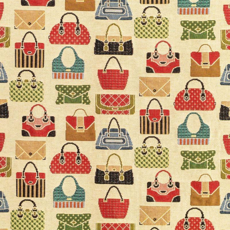 Гобелен представляет собой ткань, выполненную перекрестным плетением нитей с одномоментным созданием сюжетной или орнаментальной композиции. Это плотный материал высокую прочность и износостойкость. Гобелен используют для пошива плотных светонепроницаемых штор, декоративного домашнего текстиля и аксессуаров, в мебельном производстве для обивки мебели. Так же применяется в рукоделии: модные кошельки, сумочки, пояса и другие аксессуары и при изготовлении дизайнерской одежды. На спокойном песочном фоне цветное разнообразие милых женских сумочек, клатчей, кошелечков.