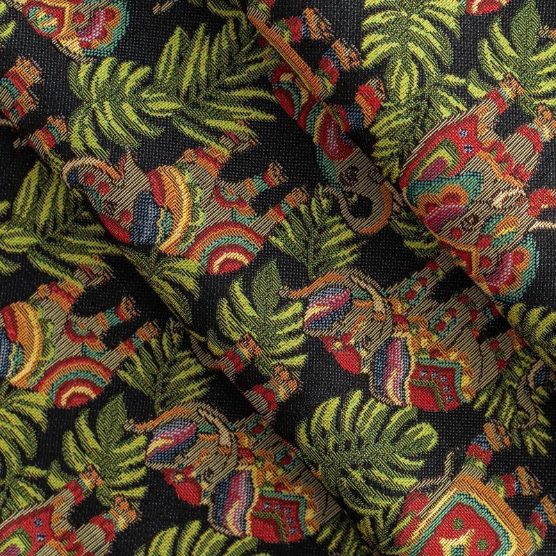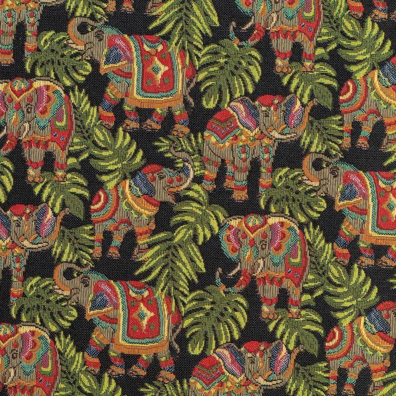 Гобелен представляет собой ткань, выполненную  перекрестным плетением нитей с одномоментным созданием сюжетной или орнаментальной композиции. Это плотный материал высокую прочность и износостойкость. Гобелен используют для пошива плотных светонепроницаемых штор, декоративного домашнего текстиля и аксессуаров, в мебельном производстве для обивки мебели. Так же применяется в рукоделии: модные кошельки, сумочки, пояса и другие аксессуары и при изготовлении дизайнерской одежды. На черном фоне цветное разнообразие тропических растений и "нарядных" слоников.