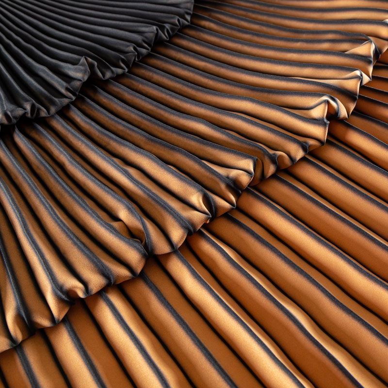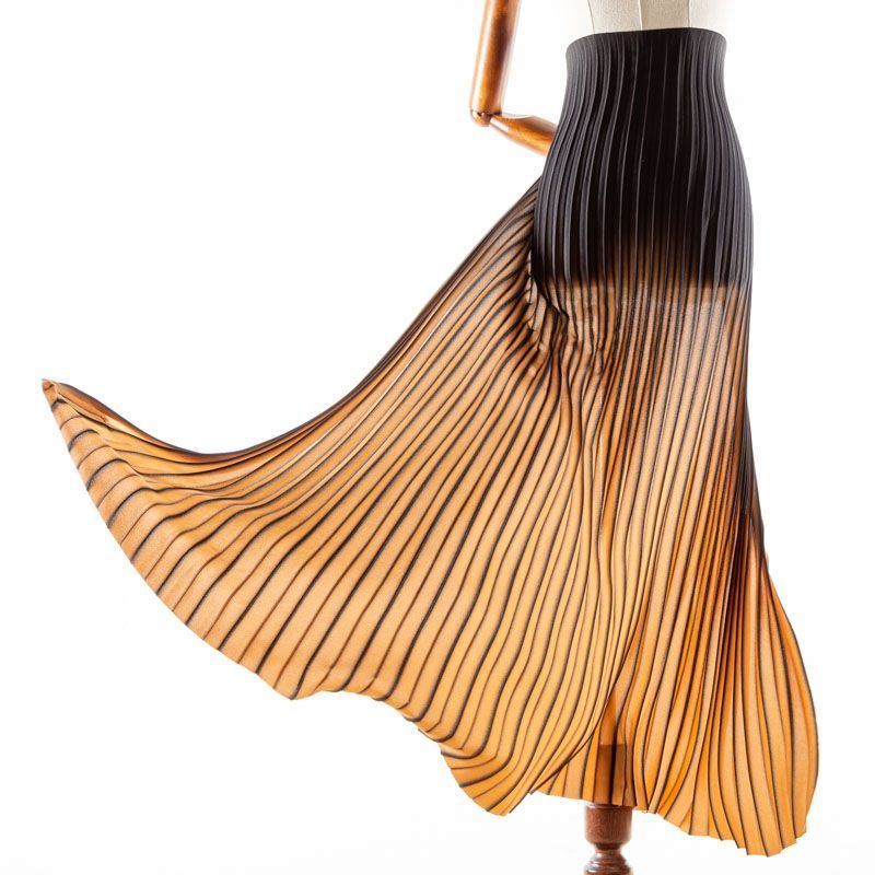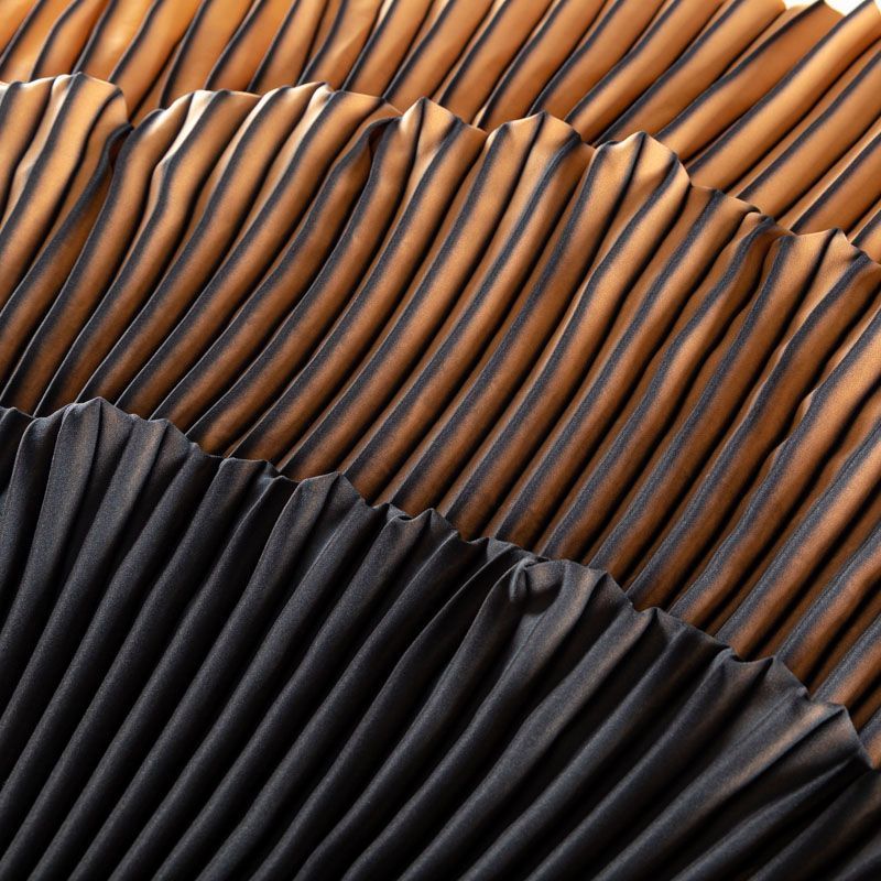 Готовый гофрированный купон из матовой креповой ткани выполнен в технике градиент от черного к карамельному оттенку. Объем по низу 180 см, по талии 60 см, длина 110 см. Ткань раскроена полусолнцем, гофре заложено сверху вниз на увеличение. Ребро складки выделено черным цветом. Гофре визуально вытягивает и стройнит фигуру, именно поэтому уже который год юбки и платья гофре находятся в числе топовых вещей женского гардероба в классическом исполнении – миди и в пол, или в оригинальном ассиметричном крое. Можно использовать для клиновидной вставки в другую юбку, в спинку или рукав.
