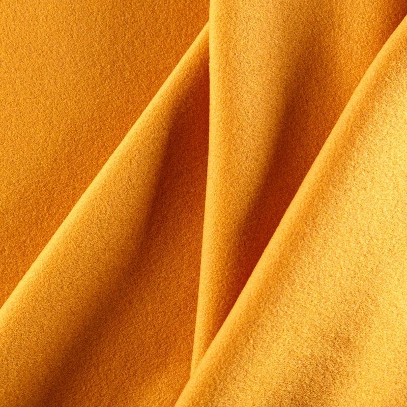 Итальянский пальтовый кашемир желтого оттенка. Ткань мягкая, пластичная, приятная на ощупь, гибкая, средней толщины, при этом высокой плотности. Поверхность имеет короткий ворс. Подойдет для пошива пальто, куртки, жакета, парки, кейпа, жакета или пончо.