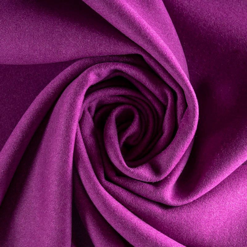 Пальтовый кашемир насыщенного сиреневого оттенка. Ткань необычайно мягкая, приятная на ощупь, гибкая, средней толщины. Поверхность имеет короткий ворс. Подойдет для пошива пальто, куртки, жакета, парки, кейпа, жакета или пончо.