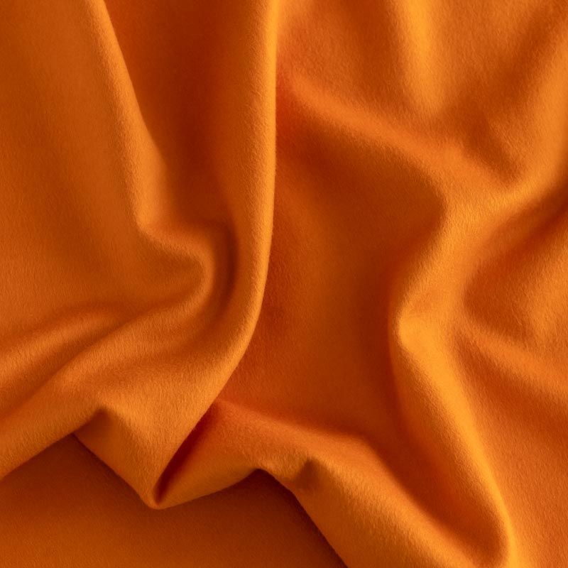 Пальтовый кашемир насыщенного оранжевого оттенка. Ткань необычайно мягкая, приятная на ощупь, гибкая, средней толщины. Поверхность имеет короткий ворс. Подойдет для пошива пальто, куртки, жакета, парки, кейпа, жакета или пончо.