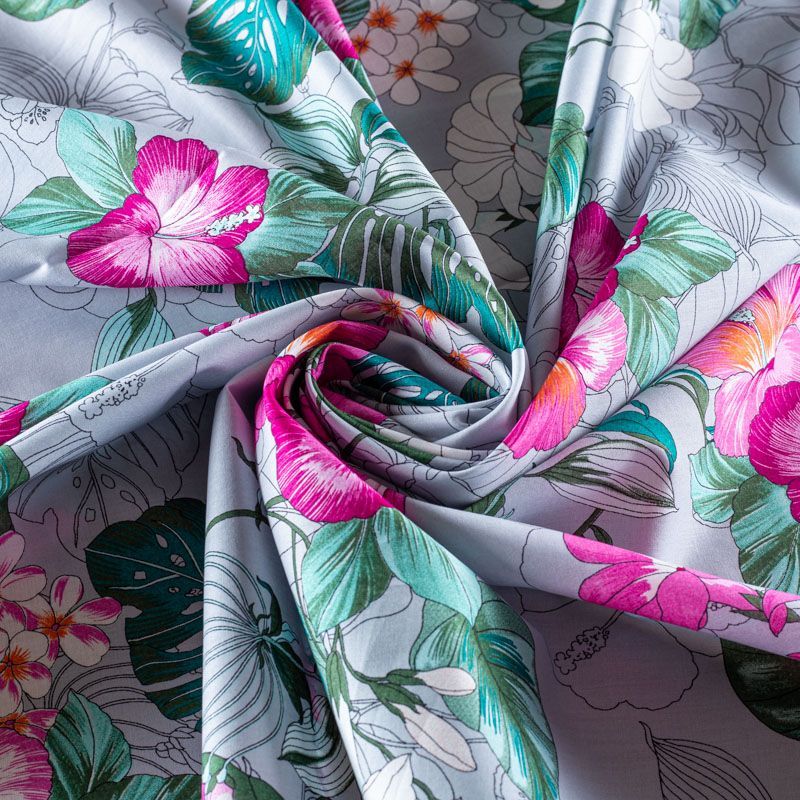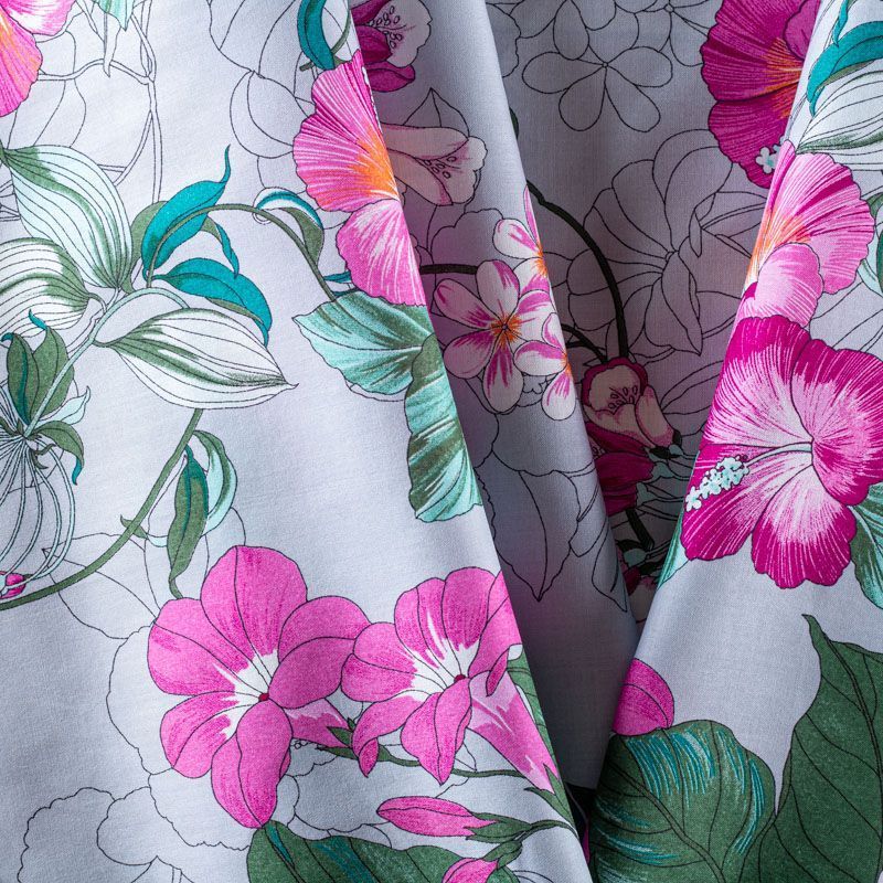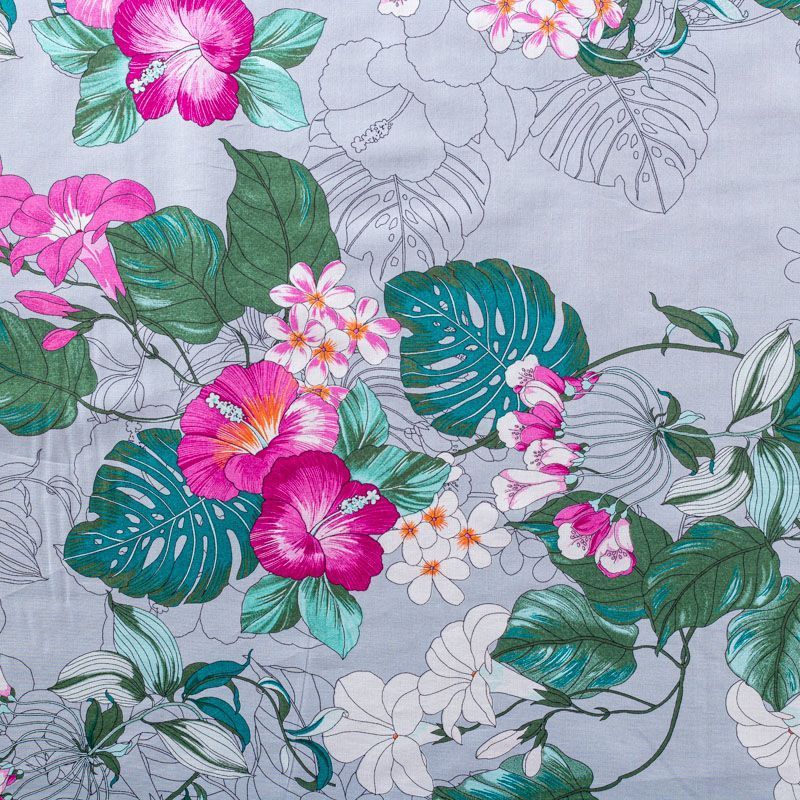 Плательно-рубашечный натуральный хлопок с ярким тропическим принтом на серо-голубом фоне. Ткань имеет плотное переплетение, матовую гладкую поверхность, хорошо держит форму, не прозрачная. Подойдет для пошива рубашек, платья-рубашки, юбки, сарафана, туники, домашней одежды.