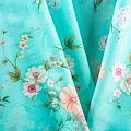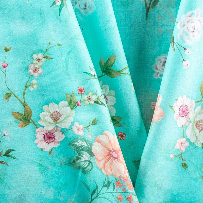 Плательно-рубашечный хлопок бирюзового оттенка с элегантным цветочным принтом. Ткань очень лёгкая, воздушная, тонкая, похожа на батист, немного прозрачная, поверхность матовая, гладкая, приятная к телу, хорошо драпируется. Прекрасно подойдет блузы, платья-рубашки, летнего сарафана, туники.