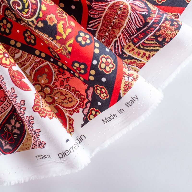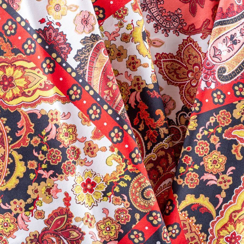 Плательно-рубашечный натуральный хлопок от французского дизайнера в красных, бежевый и черных оттенках с крупным орнаментом. Ткань имеет плотное переплетение, матовую гладкую поверхность, хорошо держит форму, не прозрачная. Подойдет для пошива рубашек, платья-рубашки, юбки, сарафана, туники, домашней одежды.