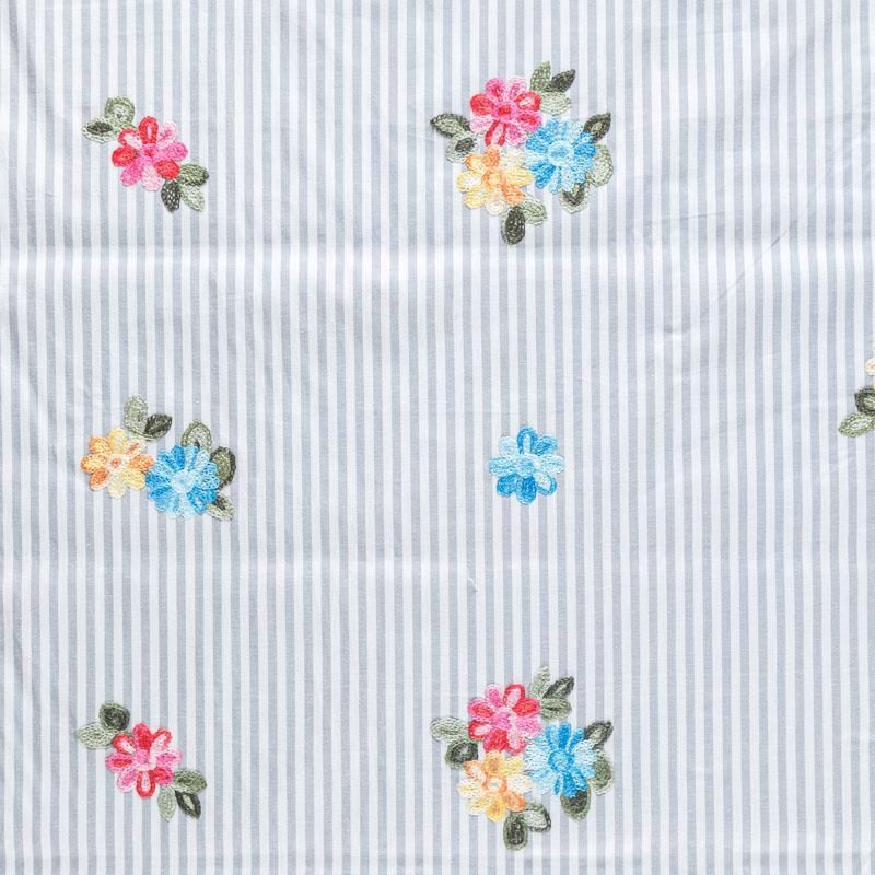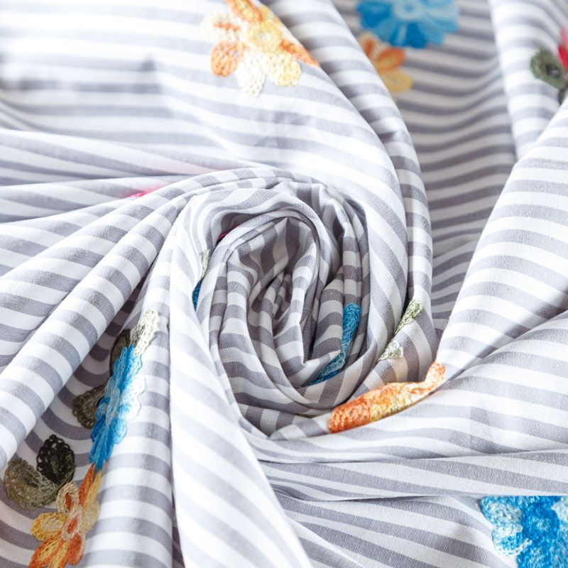 Плательно-блузочный хлопок в серо-белую полоску декорирован яркой цветочной вышивкой. Полотно средней плотности, слегка просвечивает, очень нежное и пластичное, держит форму. Материал отлично драпируется, формируя мягкие складки. Подойдет для прямых, полуприлегающих, расклешенных моделей платьев, сарафанов, а также юбки, туники, платье-рубашки.