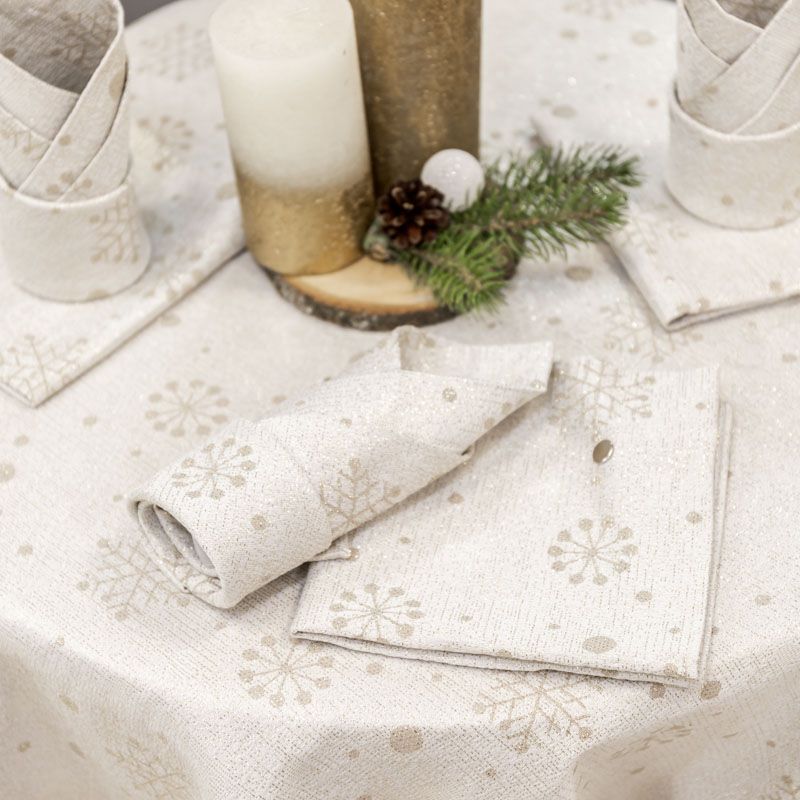 Столовый подарочный набор из смесовой хлопковой ткани натурального льняного оттенка с золотистым декором. Комплект состоит из одной прямоугольной скатерти - 160х130 см и салфеток на 6 персон размером 35х35 см.