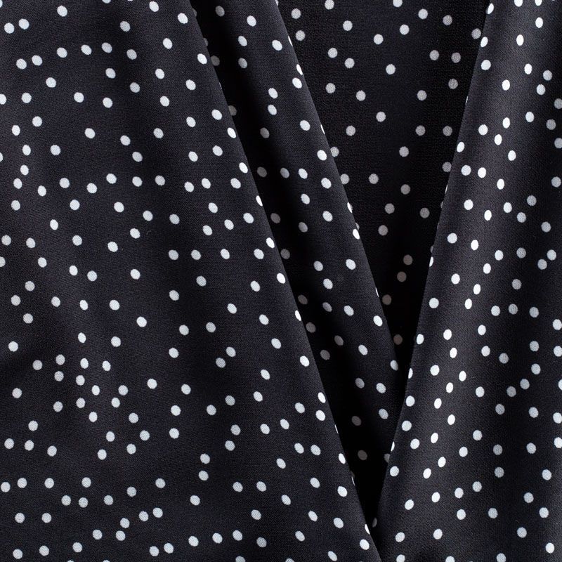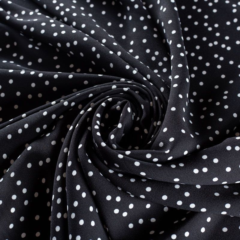 Плательный креп с принтом в мелкий горох. Ткань средней плотности, не толстая, пластичная, поверхность полотна матовая, с характерной мелкозернистой фактурой, прочная, практически не мнется, хорошо драпируется. Превосходно подойдет для пошива стильного костюма, юбки, платья, комбинезона, топа, брюк.