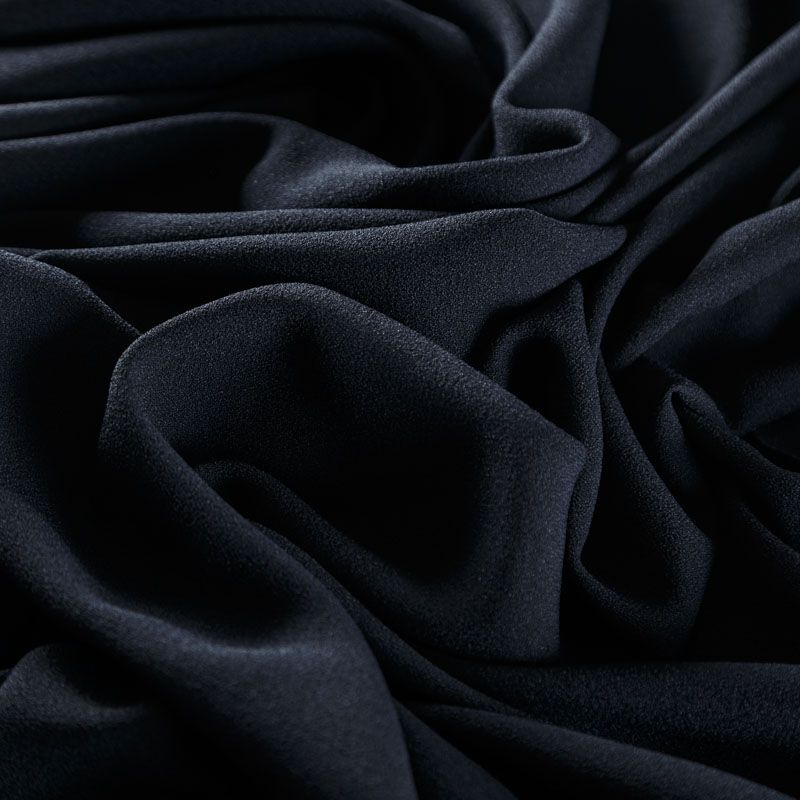 Итальянский вискозный креп костюмно-плательной плотности в черном цвете. Ткань имеет зернистую фактуру и матовую поверхность, не просвечивает, пластичная, хорошо драпируется мягкими складками, держит форму. Подходит для пошива костюма, платья, сарафана, юбки брюк, шорт, комбинезона.