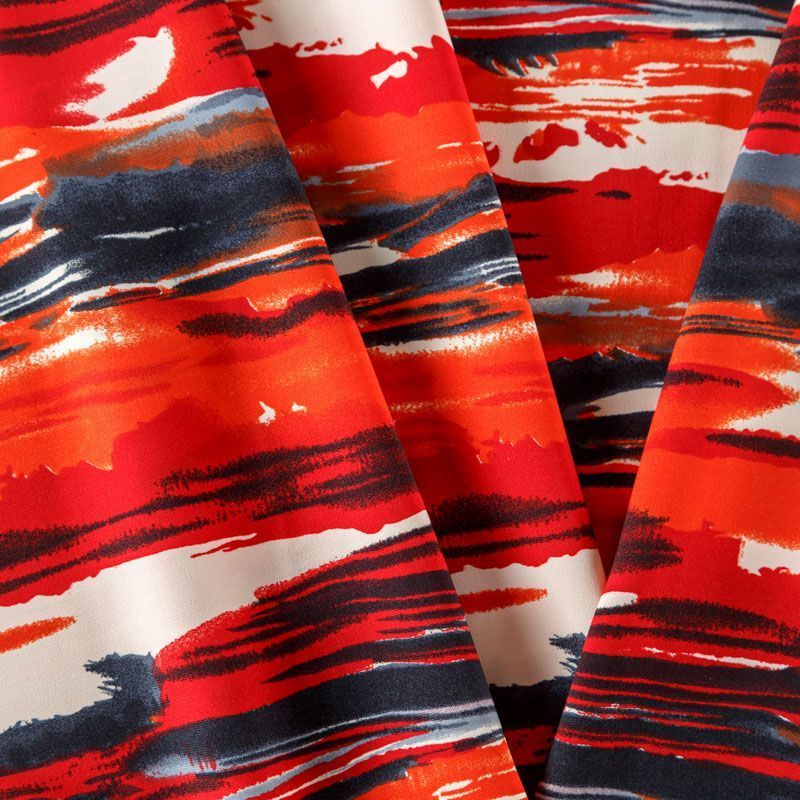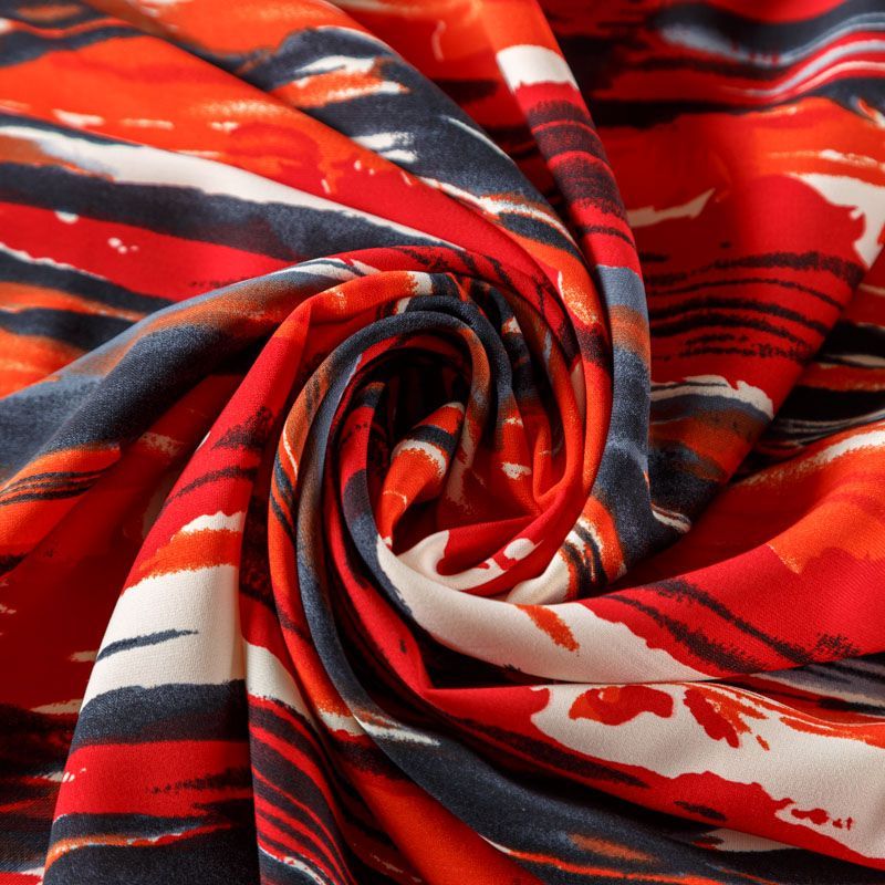 Плательный креп с абстрактным принтом. Ткань средней плотности, не толстая, пластичная, поверхность полотна матовая, с характерной мелкозернистой фактурой, прочная, практически не мнется, хорошо драпируется. Превосходно подойдет для пошива стильного костюма, юбки, платья, комбинезона, топа, брюк.