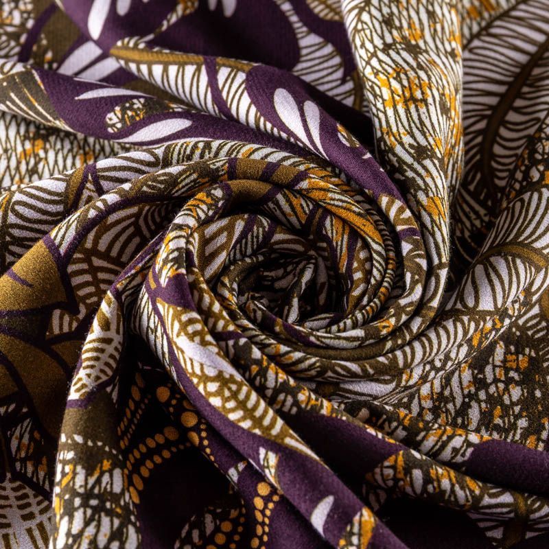 Натуральная вискозная ткань с абстрактным принтом в желто-болотных оттенках. Легкая, хорошо тянется, драпируется струящимися складками, приятная и комфортная в носке. Идеально подходит для пошива платьев, юбок, блуз, комбинезонов. Материал слегка мнется и прозрачен на свету, имеет креповую фактуру.