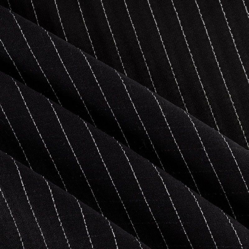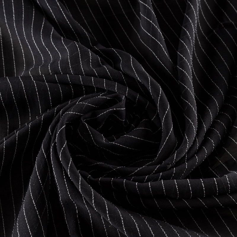 Воздушный плательно-блузочный шелк с креповой фактурой. Ткань просвечивает, тонкая, легкая, мягкая, зернистая на ощупь, пластичная, великолепно драпируется мягкими складками, ниспадает, не обладает эластичностью. При пошиве изделий может потребоваться подкладка. Идеален для платьев летящих силуэтов, топов, туник, блузок, юбок с роскошными драпировками и воланами. На черном фоне проходит белая креповая нить, расстояние между полосками 1 см.