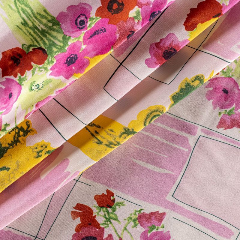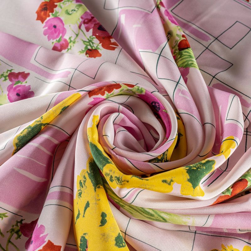 Натуральный шелковый крепдешин с матовой поверхностью, легкий, струящийся, хорошо драпируется. Ткань немного просвечивает, тянется за счет эластана в составе. Универсальный цветочный принт с сочетании в геометрическим рисунком будет уместен для пошива летнего сарафана, платья, блузки, костюма в пижамном стиле, широких брюк или юбки.