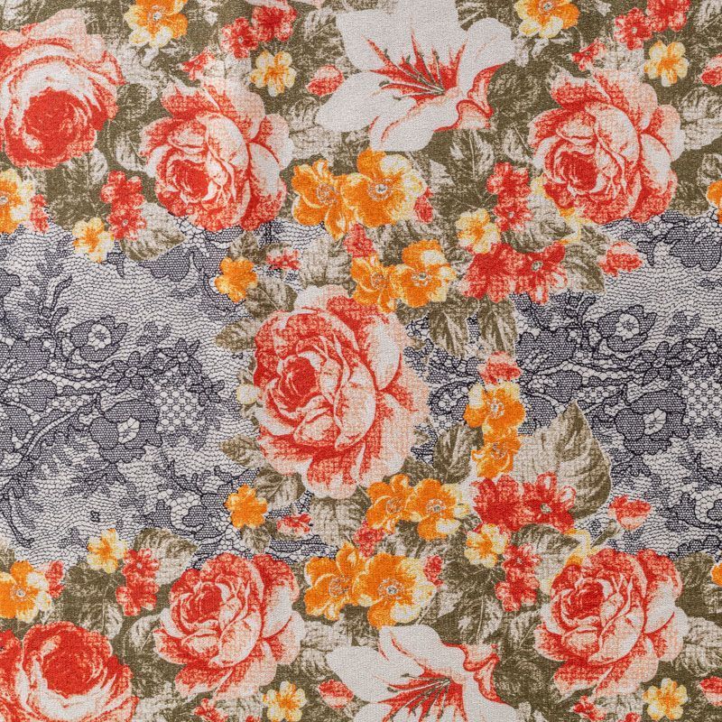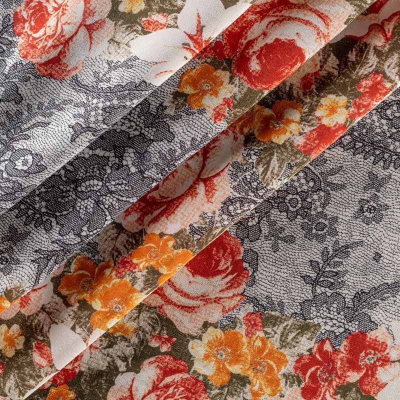 Натуральный шелковый крепдешин с матовой поверхностью, легкий, струящийся, хорошо драпируется. Изысканное сочетание яркого цветочного принта в красно-желтых оттенках с имитацией черного тонкого кружева подойдет для пошива летнего сарафана, платья, блузки, костюма в пижамном стиле, широких брюк или юбки.