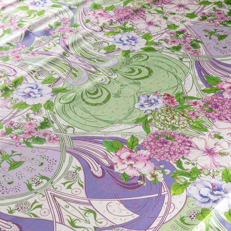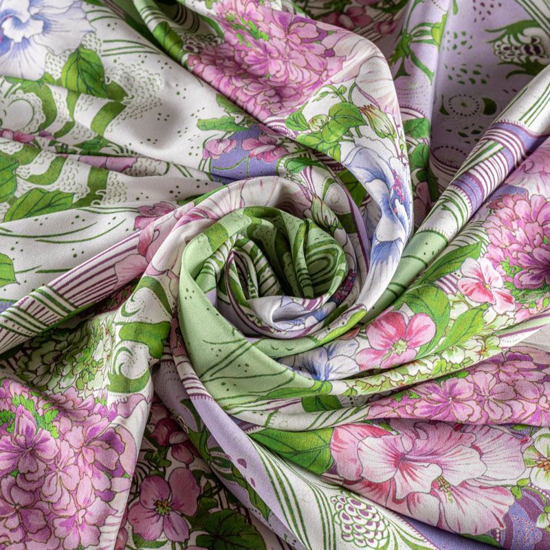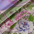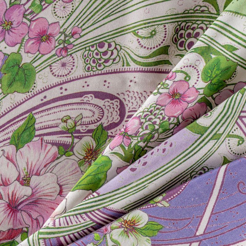 Натуральный шелковый крепдешин с матовой поверхностью, легкий, струящийся, хорошо драпируется. Цветочный принт выполнен в нежных пастельных оттенках, который будет уместен для пошива летнего сарафана, платья, блузки, костюма в пижамном стиле, широких брюк или юбки.