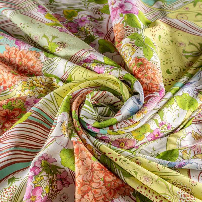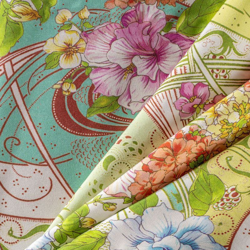 Натуральный шелковый крепдешин с матовой поверхностью, легкий, струящийся, хорошо драпируется. Цветочный принт выполнен в нежных пастельных оттенках, который будет уместен для пошива летнего сарафана, платья, блузки, костюма в пижамном стиле, широких брюк или юбки.