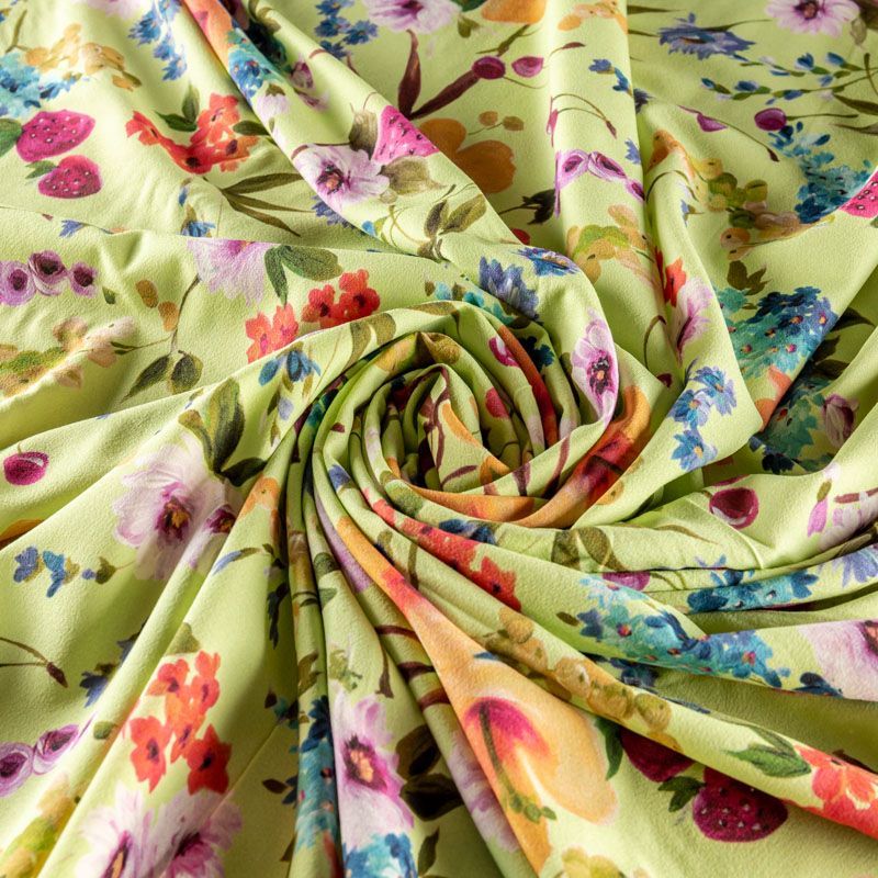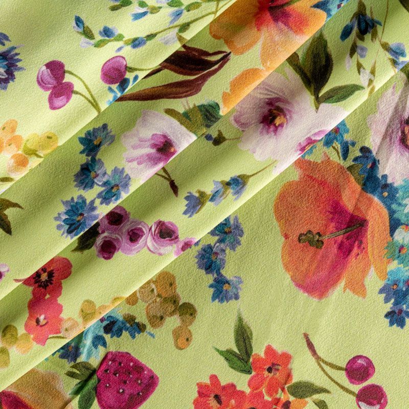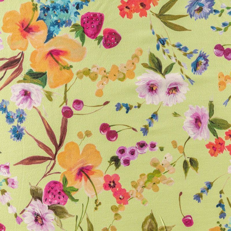 Натуральный шелковый крепдешин с добавлением хлопка с матовой поверхностью, легкий, струящийся, хорошо драпируется. Ткань немного просвечивает, хорошо тянется за счет эластана в составе. Яркий ягодно-цветочный принт на салатовом фоне прекрасно подойдет для пошива летнего сарафана, платья, блузки, костюма в пижамном стиле, широких брюк или юбки.