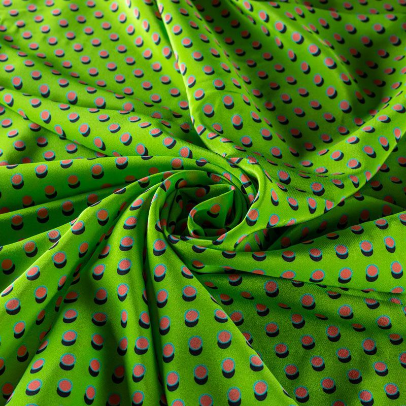 Натуральный шелковый крепдешин с матовой поверхностью, легкий, струящийся, хорошо драпируется, не просвечивает. Универсальный принт выполнен в ярких оттенках, который прекрасно подойдет для пошива летнего сарафана, платья, блузки, костюма в пижамном стиле, широких брюк или юбки.
