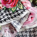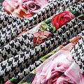 Итальянский крепдешин с матовой лицевой поверхностью с принтом гусиная лапка и цветами, тонкий, слегка прозрачный, отлично драпируется, тянется за счет эластана в составе, легкий и струящийся. Идеально подойдет для пошива платьев и сарафанов расклешенных моделей, с воланами, летящих юбок, топов, блузки, костюма в пижамном стиле.