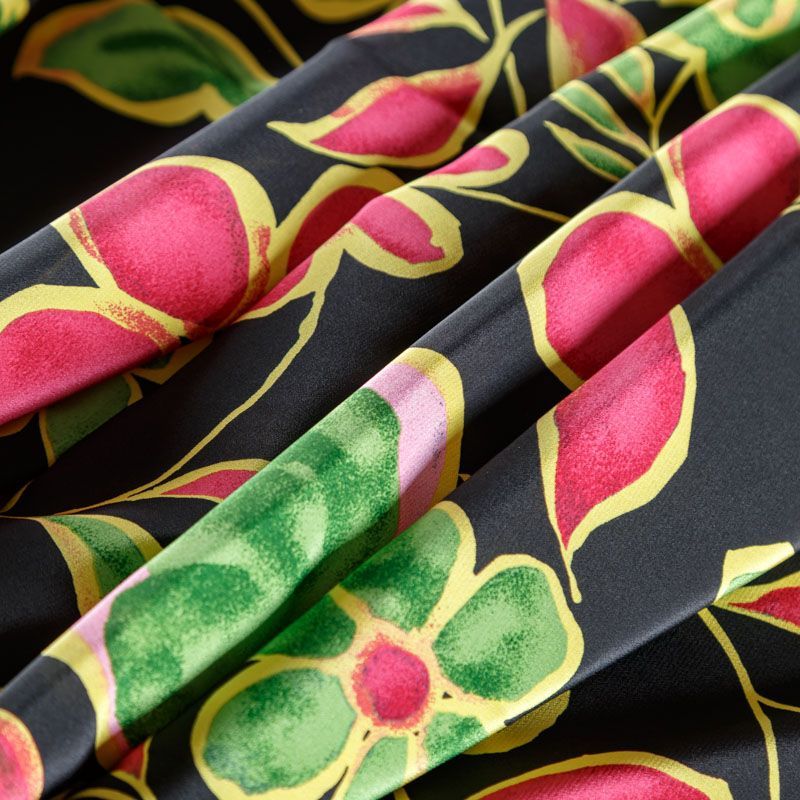 Итальянский крепдешин с матовой лицевой поверхностью со стилизованным акварельным цветочным принтом, тонкий, слегка прозрачный, отлично драпируется, легкий и струящийся. Идеально подойдет для пошива платьев и сарафанов расклешенных моделей, с воланами, летящих юбок, топов, блузки, костюма в пижамном стиле.