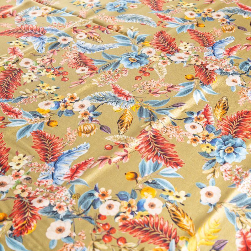 Шикарный итальянский непрозрачный крепдешин с матовой поверхностью. Красивый фантазийный цветочный принт на золотисто-оливковом фоне сделает образ необычным и женственным. Ткань очень приятная к телу, олично драпируется, пластичная и практически не мнётся. Прекрасно подходит для пошива блузки, топа, струящегося платья, красивого комбинезона, костюма в пижамном стиле.