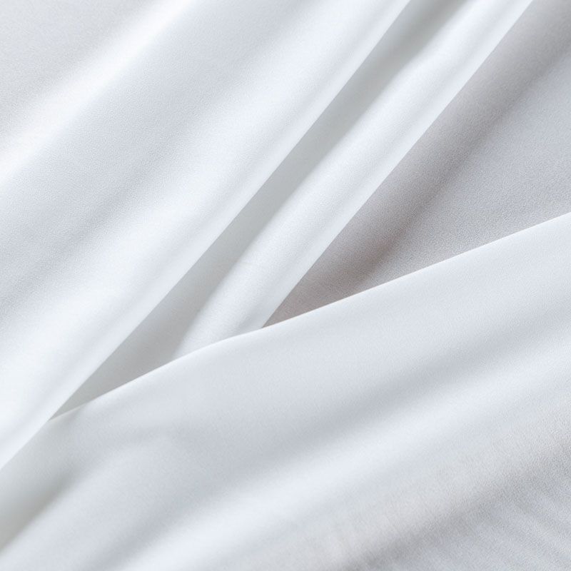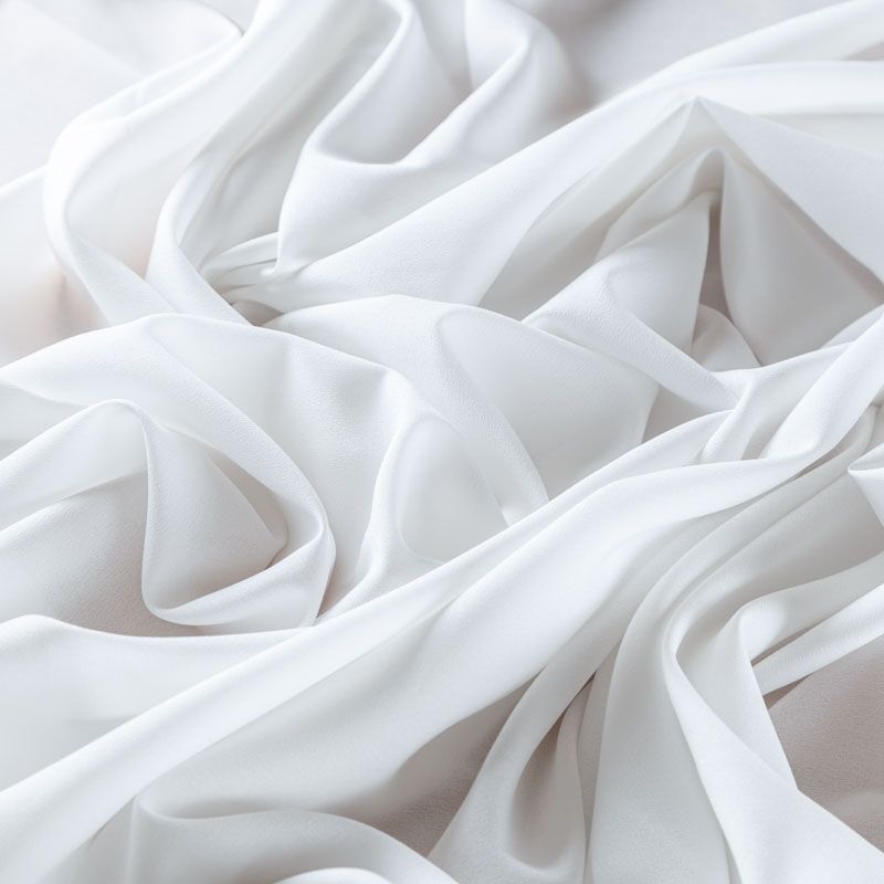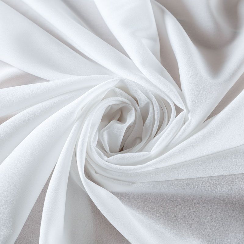 Крепдешин белого цвета, тонкий, легкий, фактурный, приятный на ощупь. Очень пластичный, тянется за счет эластана в составе, прекрасно драпируется и струится. Ткань слегка просвечивает, можно использовать подклад. Идеально будет смотреться в платье, юбке, тунике, рубашке или блузке.