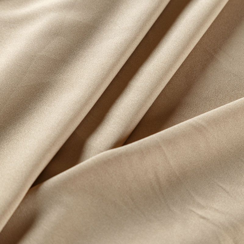 Крепдешин бежевого оттенка с желтоватым подтоном, тонкий, легкий, фактурный, приятный на ощупь. Очень пластичный, тянется за счет эластана в составе, прекрасно драпируется и струится. Ткань слегка просвечивает, можно использовать подклад. Идеально будет смотреться в платье, юбке, тунике, рубашке или блузке.