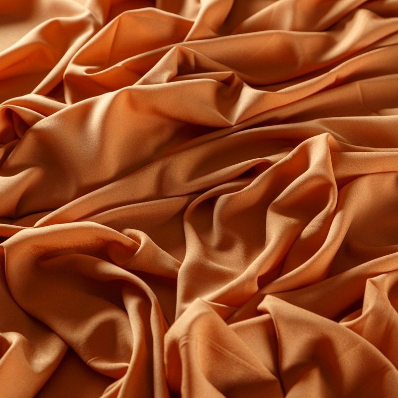 Крепдешин оранжевого оттенка, тонкий, легкий, фактурный, приятный на ощупь. Очень пластичный, тянется за счет эластана в составе, прекрасно драпируется и струится. Ткань слегка просвечивает, можно использовать подклад. Идеально будет смотреться в платье, юбке, тунике, рубашке или блузке.